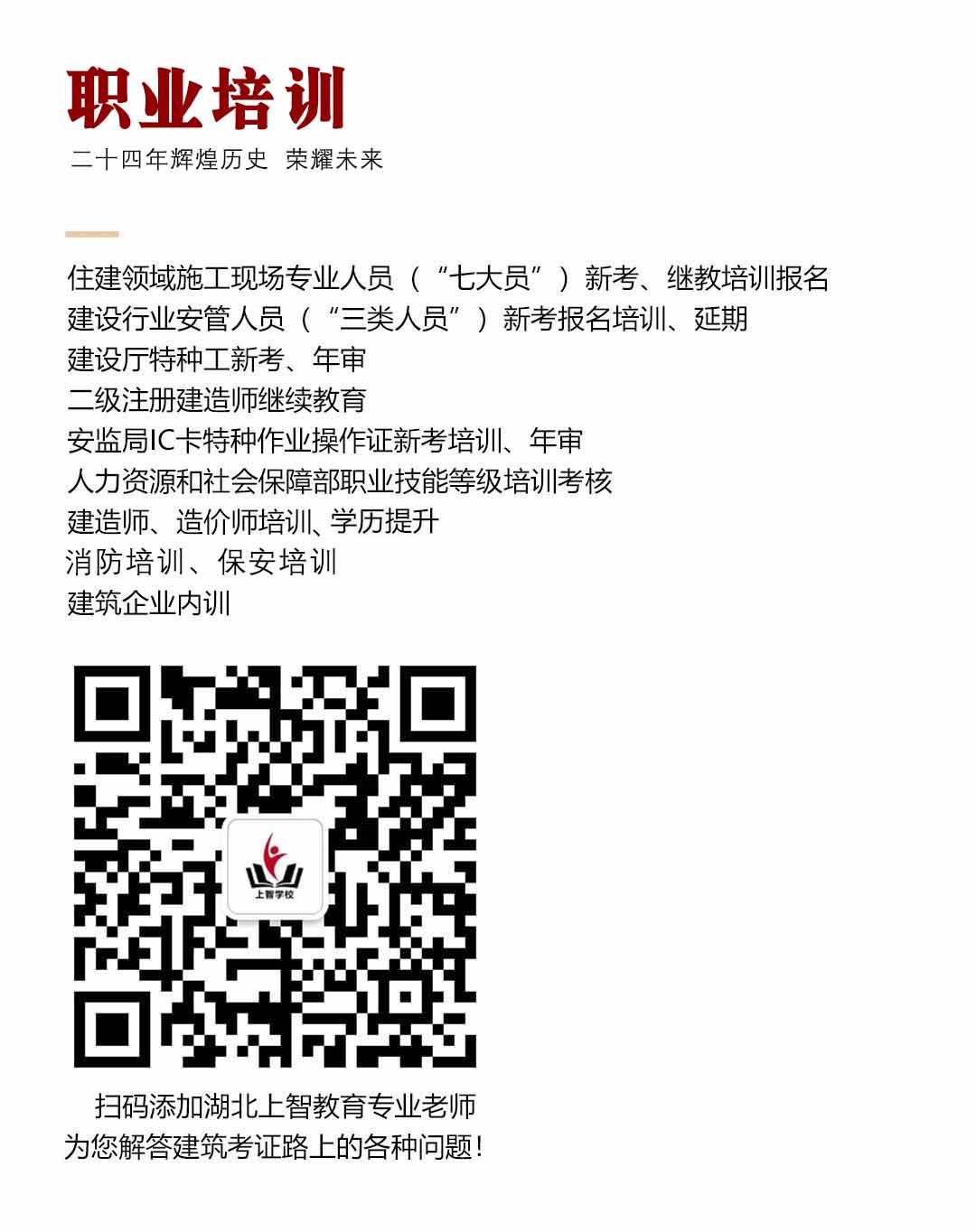 湖北上智职业培训学校成立于2002年,学校是经湖北省住房和城乡建设厅批准的建设行业关键岗位人员(“八大员”)、安管人员(“三类人员”)、特种作业人员培训机构,学校为湖北建设教育协会会员单位,学校办学许可证号:人社民4200003000096号。学校多次被湖北省住房和城乡建设厅评为“湖北省建设行业职业岗位培训机构合格单位”。